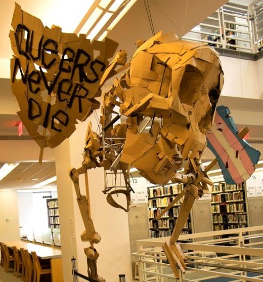 The Degenderettes “Queers Never Die” skeleton puppet, hanging outside the Hormel Center. Photo credit: James Menchini.